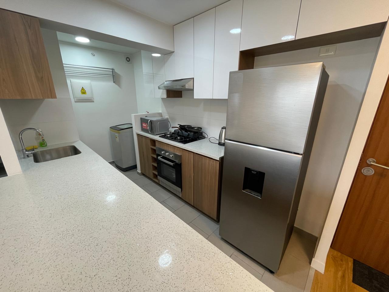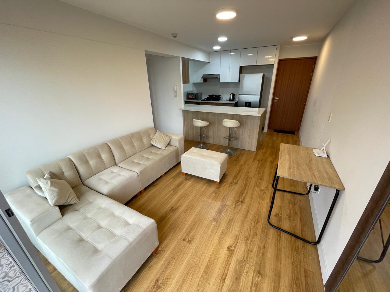 La vista que ofrece desde la terracita es lindísima y además viene equipado con cama Queen y clóset en el dormitorio, también con muebles de sala, en la cocina con reposteros altos, bajos, refrigerador, cocina, horno, cafetera, enseres y útiles de cocina diversos y con 2 lindas sillas altas para la barra que acompaña al Kitchenette. En la lavandería puedes hacer uso de la lavadora y podrás notar también que se cuenta con therma para que tengas agua caliente en todos los caños y ducha. Tomar en cuenta además que cuenta con Gas Calidda, lo cual permitirá un mayor ahorro a tu economía.